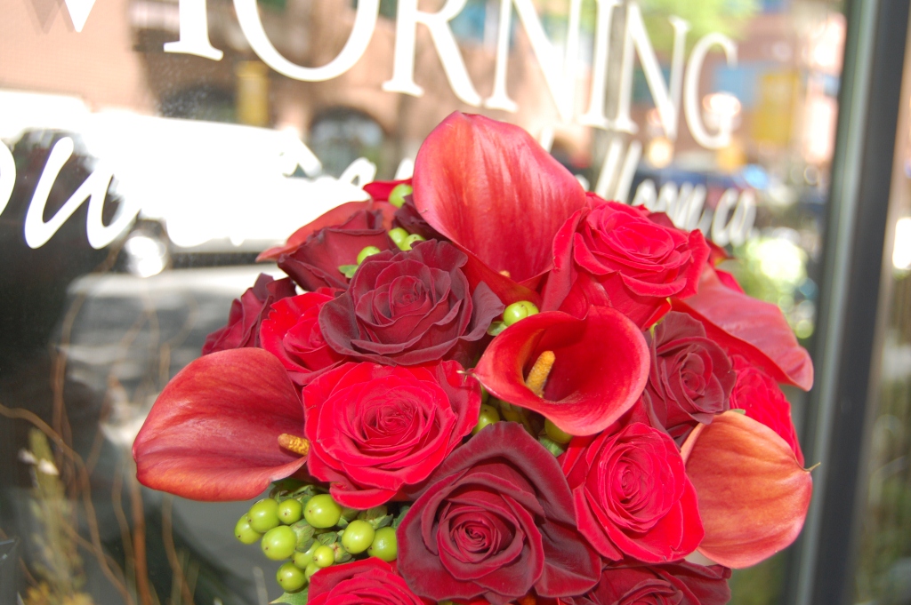 A red bridal bouquet is not for everyone but if you want to go bold, this just might be the wedding color for you! This bouquet made for our bride Alex yesterday was both striking and dramatic. Red roses in 2 shades and red mini callas accented with green hypericum berries was a sight to be hold!!